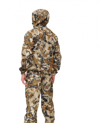 На куртке два верхних накладных кармана с клапанами на кнопках и два нижних прорезных с листочками.Брюки по низу регулируются утяжками. Пояс брюк на широкой резинке, снабжен шлевками, дополнительно регулируется шнурками.