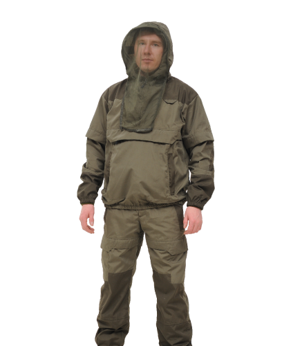 Модель состоит из куртки-анорак с капюшоном и съемной москитной сеткой для лица и удобных, надежных штанов. Все манжеты исполнены в виде плотной, но недавящей резинки, которая препятствует проникновению под костюм насекомых. Кроме того, костюм пропитан специальными акарицидными средствами от клещей (активны в течение 20 стирок).