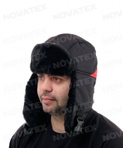 Материал верха - мембранная ткань "Кошачий глаз", на подкладе флис и утеплитель "Термотекс". Застегивается на фастекс. На козырьке, внутренней части ушей и затылочной части утеплена искусственным мехом. Козырек отстегивается - зафиксирован на две кнопки. Объем шапки регулируется по обхвату головы. Уши шапки можно убрать назад и зафиксировать на две кнопки.