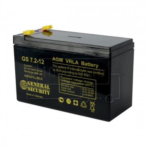 General Security GS 7,2-12 - аккумуляторная батарея общего применения со сроком службы 3-5 лет в буферном режиме или более 260 циклов заряда-разряда в циклическом режиме при 100 % разряде. Перезаряжаемая, высоко-эффективная, непроливаемая и не требует обслуживания.