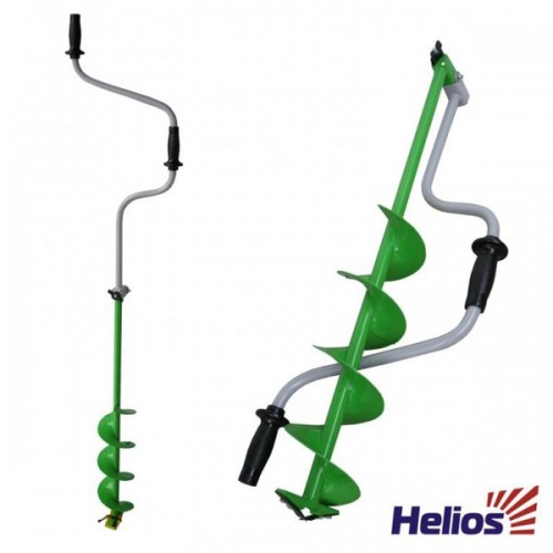Ледобур Helios HS-130D - ледобур рыболовный складной шнековый с диаметром бурения 130мм. Верхняя рукоятка ледобура смещена относительно оси ледобура на 130 мм, а нижняя на 150 мм. Такое расположение рукояток позволяет вращать ледобур одновременно двумя руками, тем самым, увеличивая скорость бурения лунок во льду.